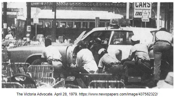 The Victoria Advocate. (1979, April 28). Fiesta Parade Canceled; Witnesses Relate Incident. The Victoria Advocate, 1 & 6. https://www.newspapers.com/image/437562322/ ; https://www.newspapers.com/image/437562342/