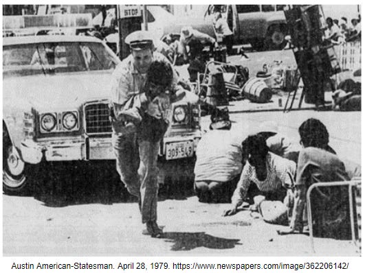Schwab, R. (1979, April 28). Sniper’s Bullets Shatter Fiesta. Austin American - Statesman, 1 & 10. https://www.newspapers.com/image/362206142/ ; https://www.newspapers.com/image/362207995