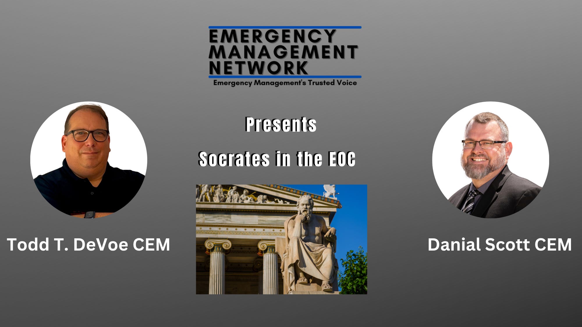 In this episode of The Emergency Management Network, hosts Todd DeVoe and Dan Scott explore Socrates's timeless philosophy and how his method of inquiry, humility, and pursuit of wisdom apply to today’s emergency operations centers (EOCs). Through the Socratic lens, we examine leadership under pressure, decision-making amidst uncertainty, and the value of questioning assumptions in complex incident management.