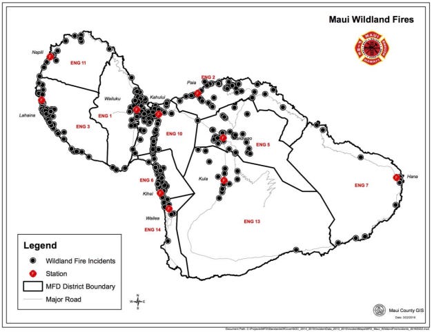 Despite being nearly a decade old, this map, which illustrates the locations of wildfire calls between 2013 and 2015 (Maui Fire Department, 2016) also showcases the only main road along the Lahaina coast called the Honoapi'ilani Highway. When wildfires or other hazards occur along this route, emergency response and evacuation become a serious and consistent problem. Had this highway (which makes Lahaina accessible to the airport and fire station) been destroyed, there is no telling how much worse it could have been.