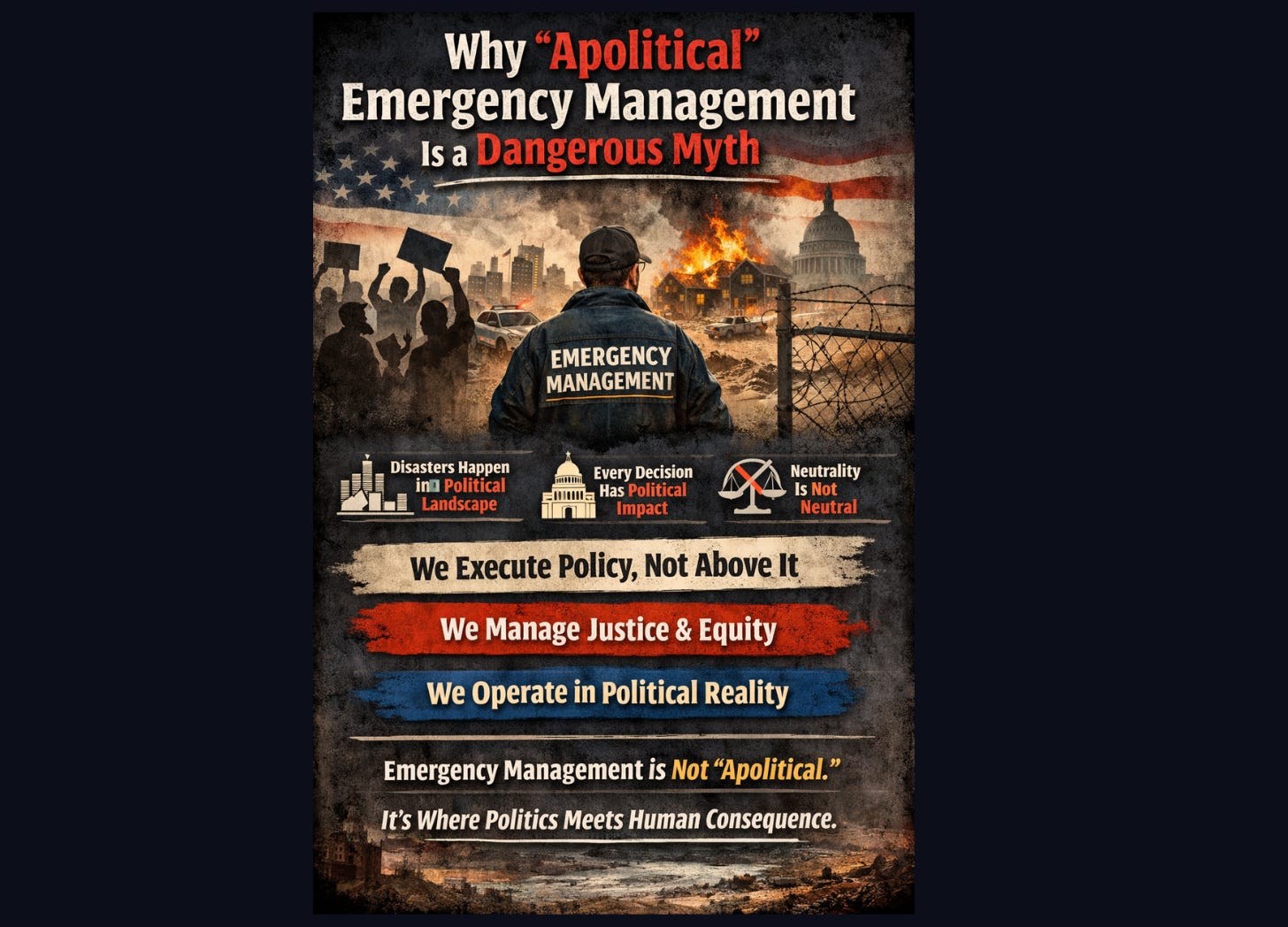 Emergency management likes to describe itself as apolitical. We say it to protect credibility. We say it to stay neutral. We say it because we believe disasters should be handled with professionalism, evidence, and compassion, not ideology.
